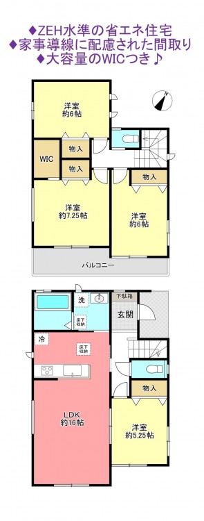- システムキッチン、カウンターキッチン、洗浄便座、浴室乾燥機、追い焚き、複層ガラス、ウォークインクローゼット、モニタ付インターホン、駐車場2台分、床下収納、トイレ2箇所