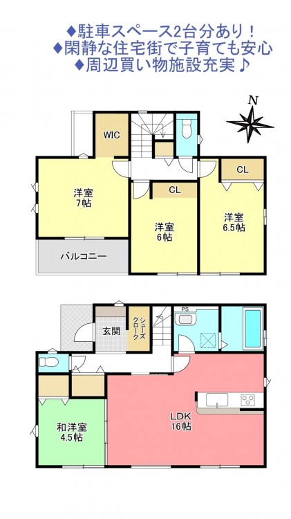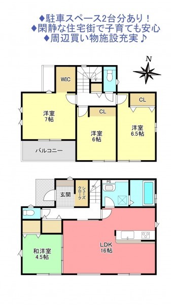 - システムキッチン、カウンターキッチン、洗浄便座、浴室乾燥機、追い焚き、複層ガラス、ウォークインクローゼット、モニタ付インターホン、駐車場2台分、床下収納、トイレ2箇所