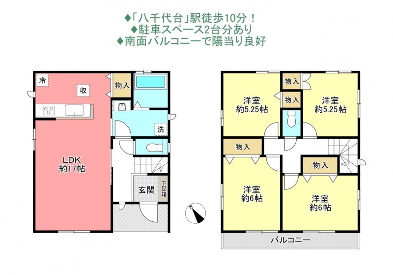 - システムキッチン、カウンターキッチン、駐車場2台分、床下収納、トイレ2箇所