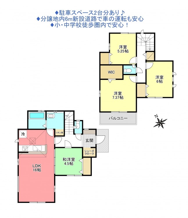 - システムキッチン、カウンターキッチン、シャンプードレッサー、洗浄便座、浴室乾燥機、追い焚き、複層ガラス、ウォークインクローゼット、モニタ付インターホン、駐車場2台分、床下収納、トイレ2箇所