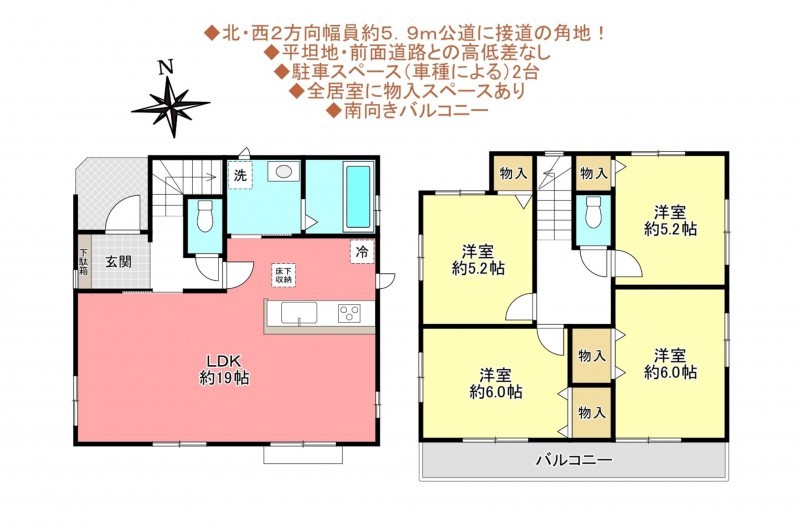 ◆北・西2方向幅員約5.9m公道に接道の角地!