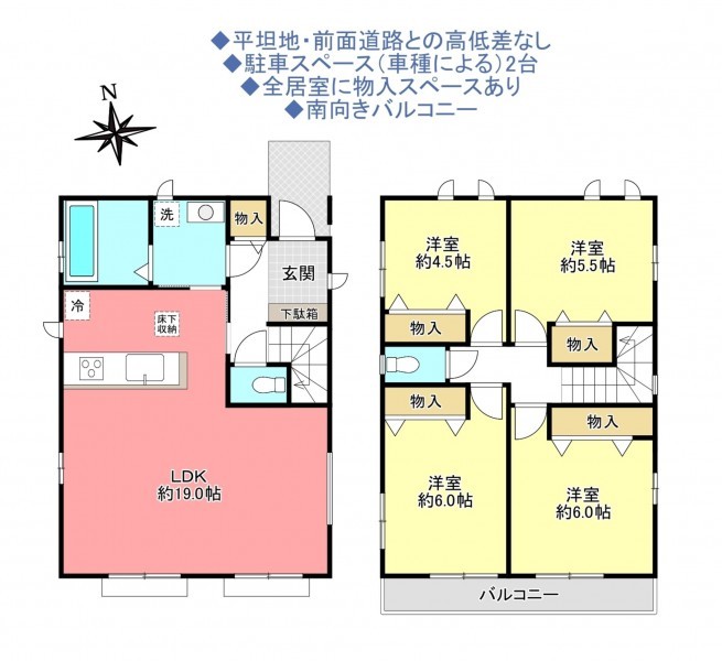 - システムキッチン、カウンターキッチン、食器洗浄乾燥機、洗浄便座、駐車場2台分、床下収納、トイレ2箇所