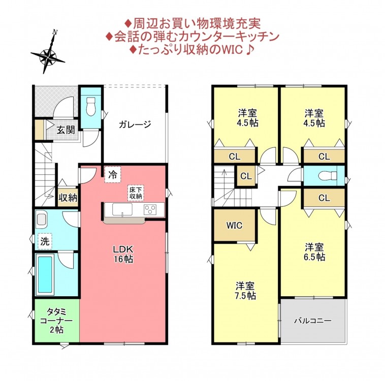 - システムキッチン、カウンターキッチン、シャンプードレッサー、洗浄便座、浴室乾燥機、複層ガラス、ウォークインクローゼット、モニタ付インターホン、床下収納、トイレ2箇所